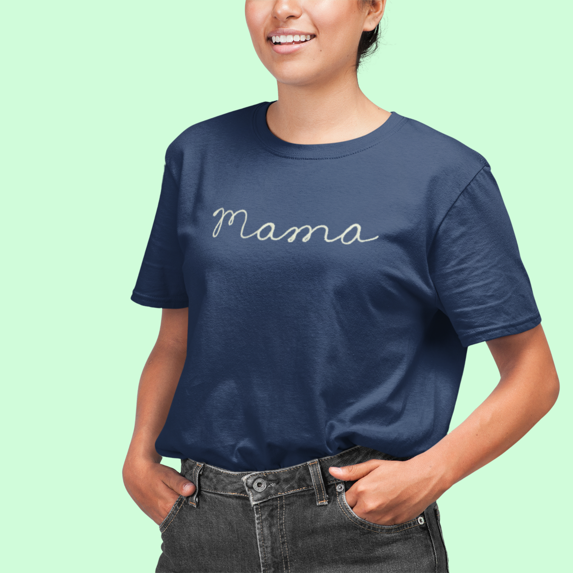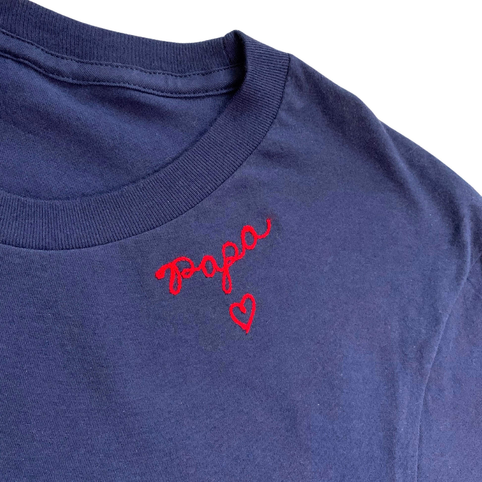 Our best selling navy t-shirt, personalized with chainstitch embroidery. Design your own custom tee with vintage-style chainstitch lettering. An elevated basic you'll love for years to come.