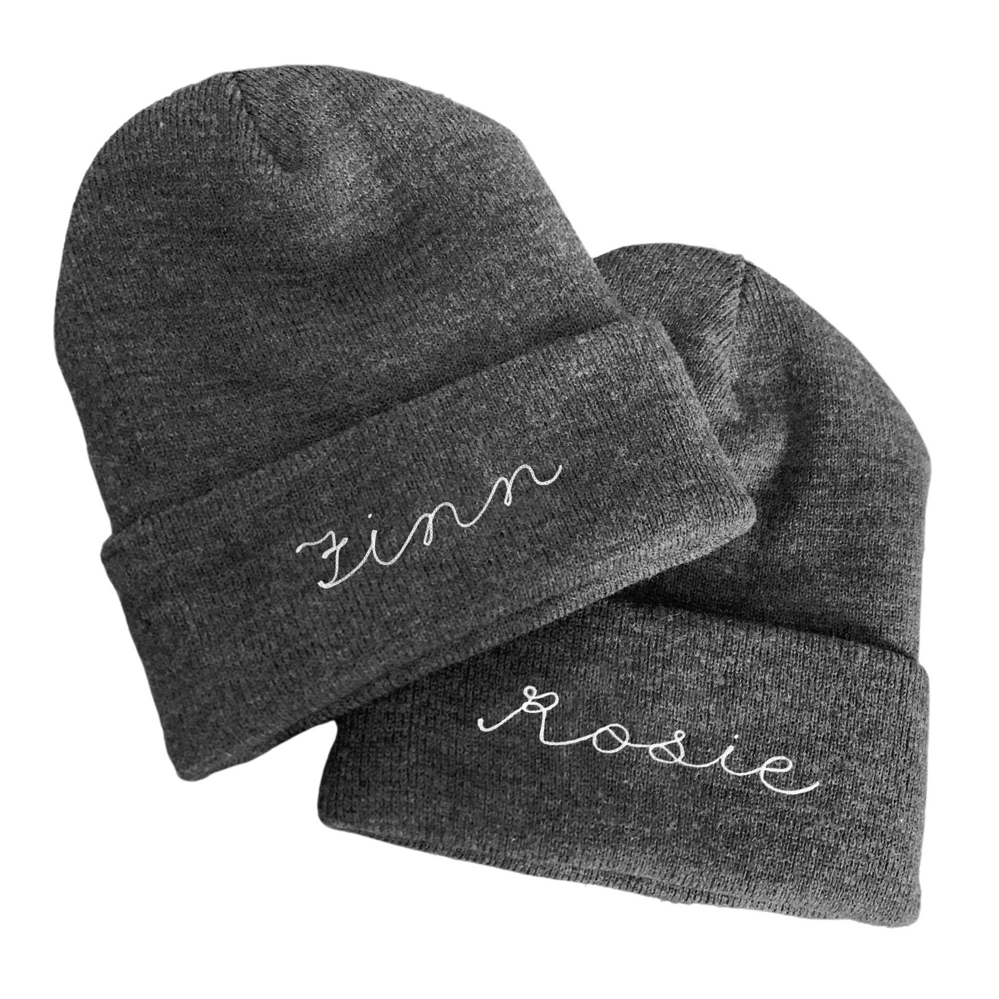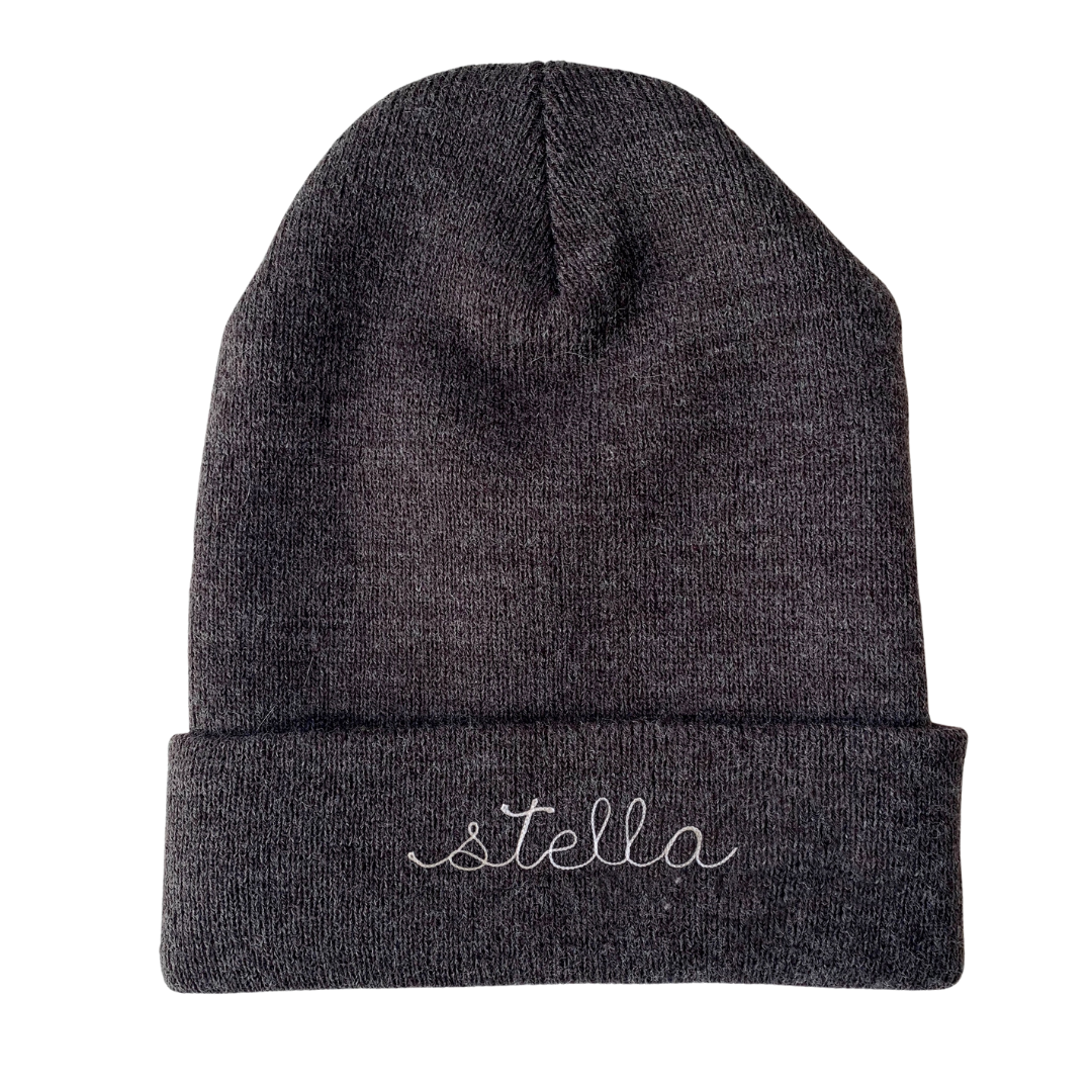 Design your own charcoal gray rib knit beanie with custom chainstitch lettering.
