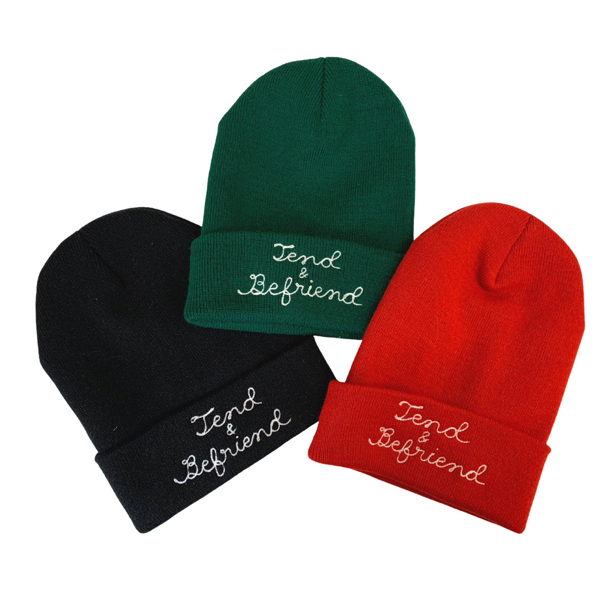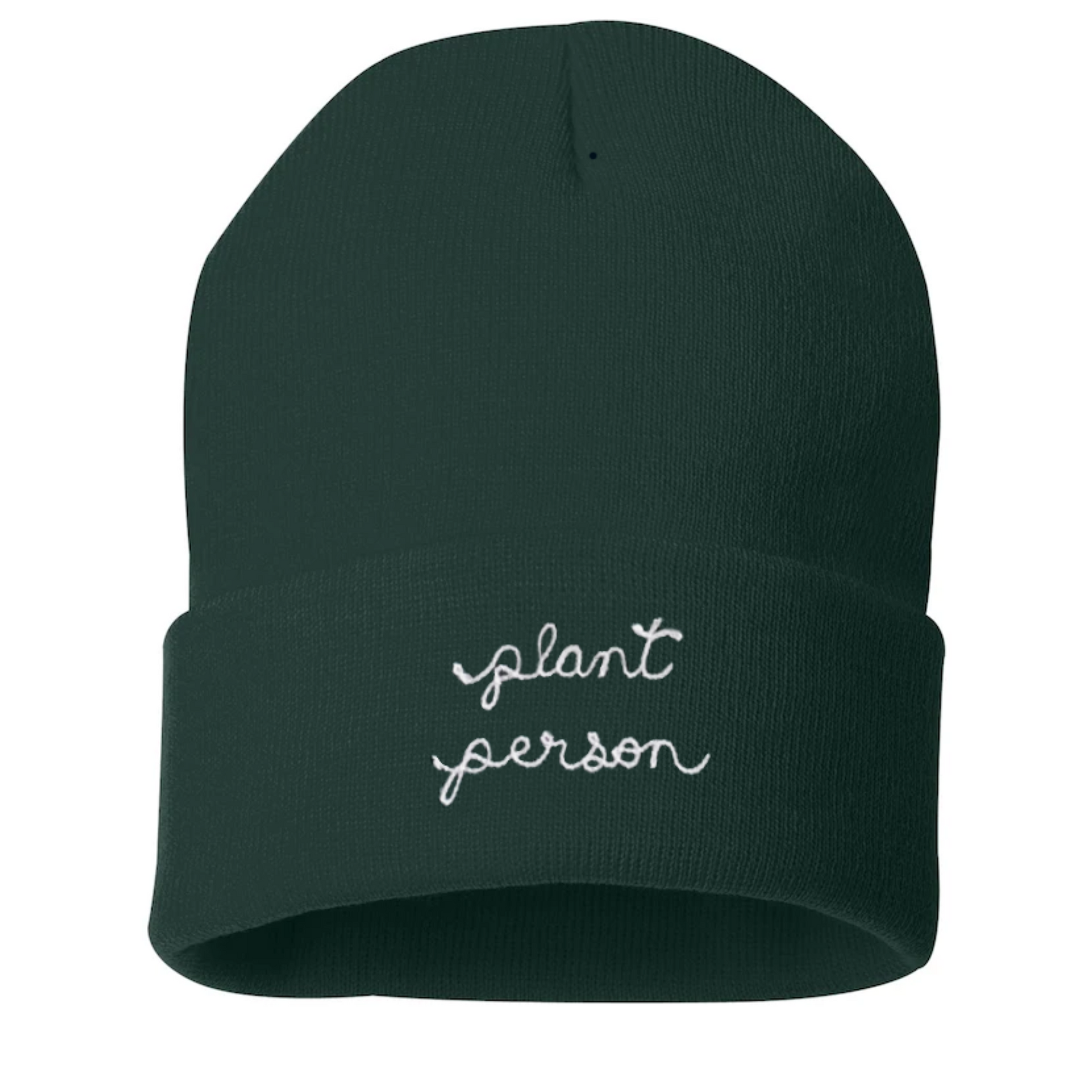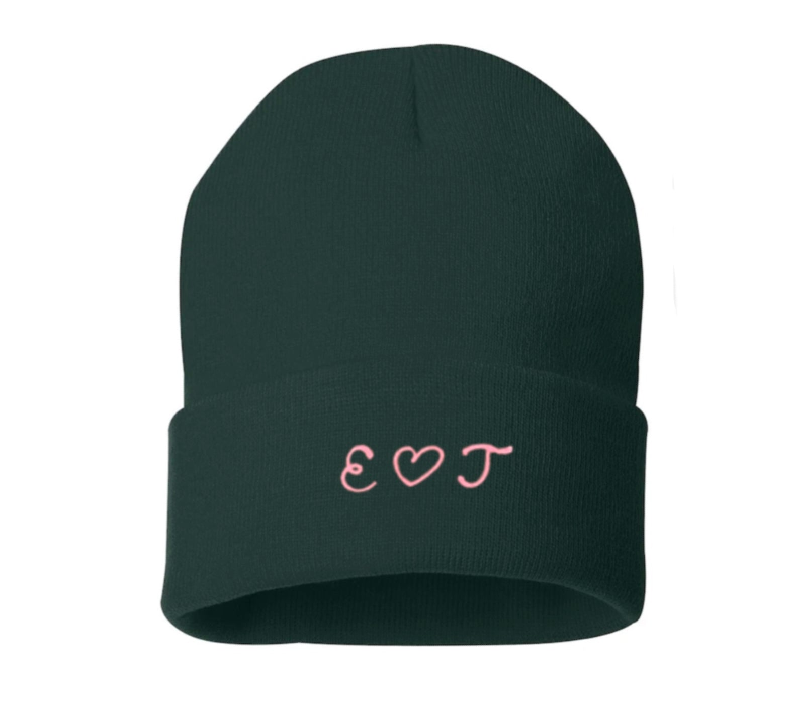 Design your own forest green rib knit beanie with custom chainstitch lettering.