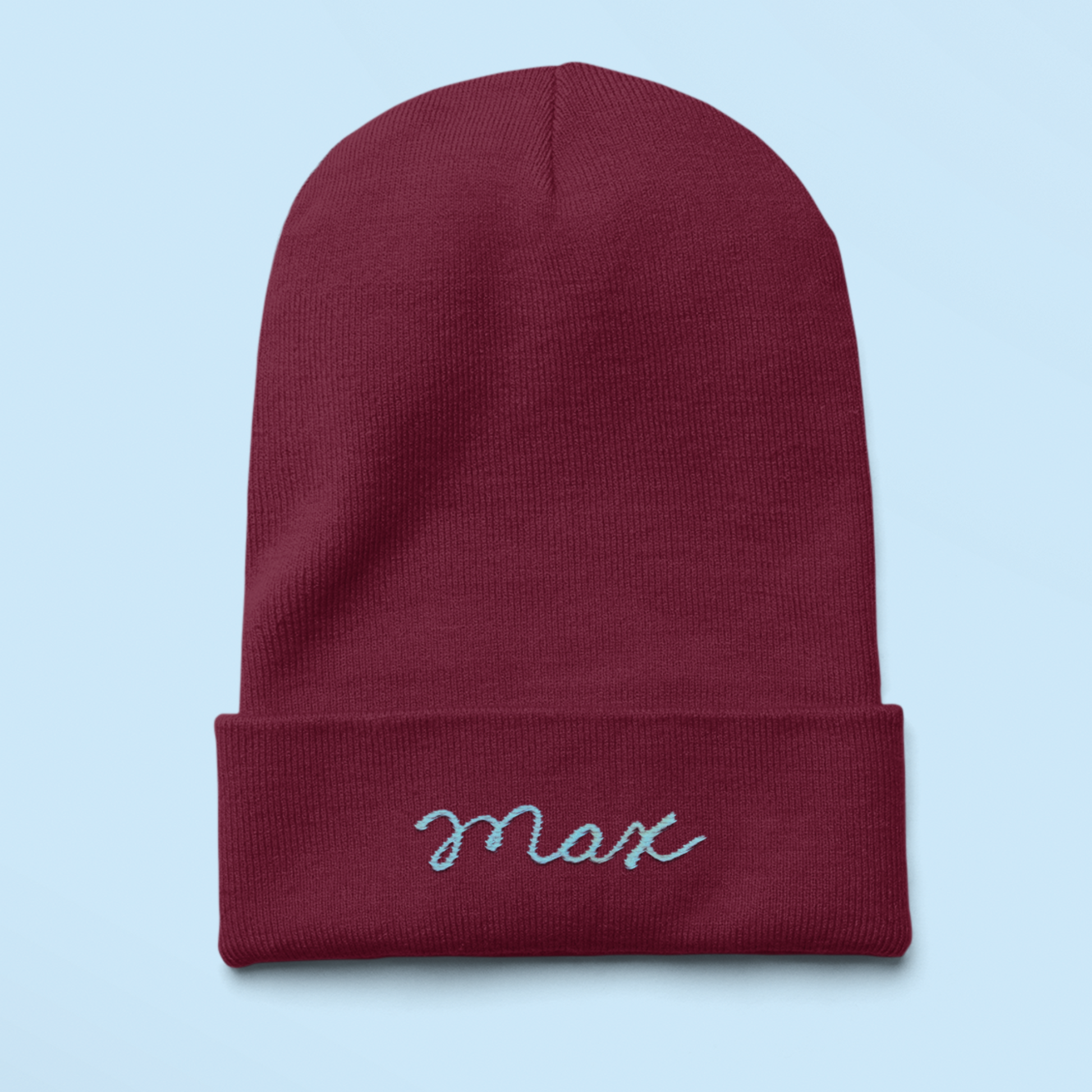 Design your own maroon rib knit beanie with custom chainstitch lettering.