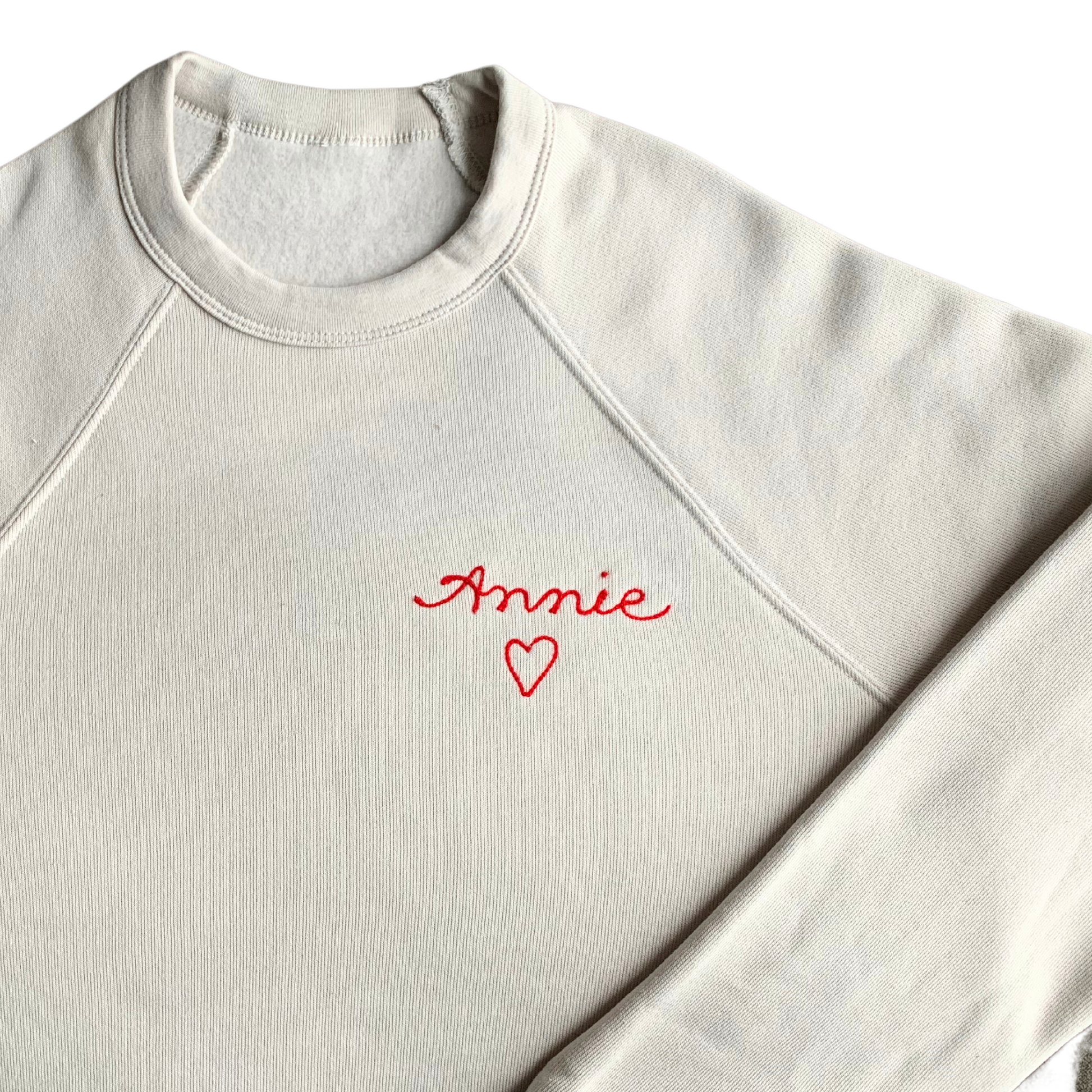 Our best selling sweatshirt in a vintage cream, personalized just for you! Made of super comfy ringspun cotton with your choice of vintage-style chainstitch lettering. The perfect cozy gift for yourself or someone you love.