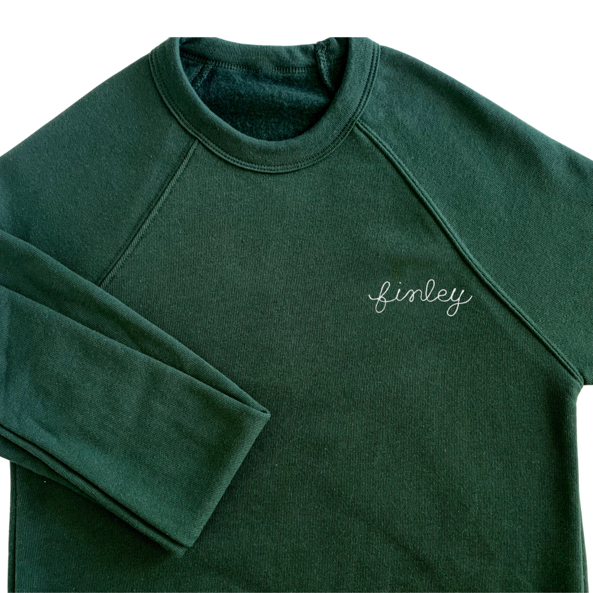 Our best selling sweatshirt in forest green, personalized just for you! Made of super comfy ringspun cotton with your choice of vintage-style chainstitch lettering.