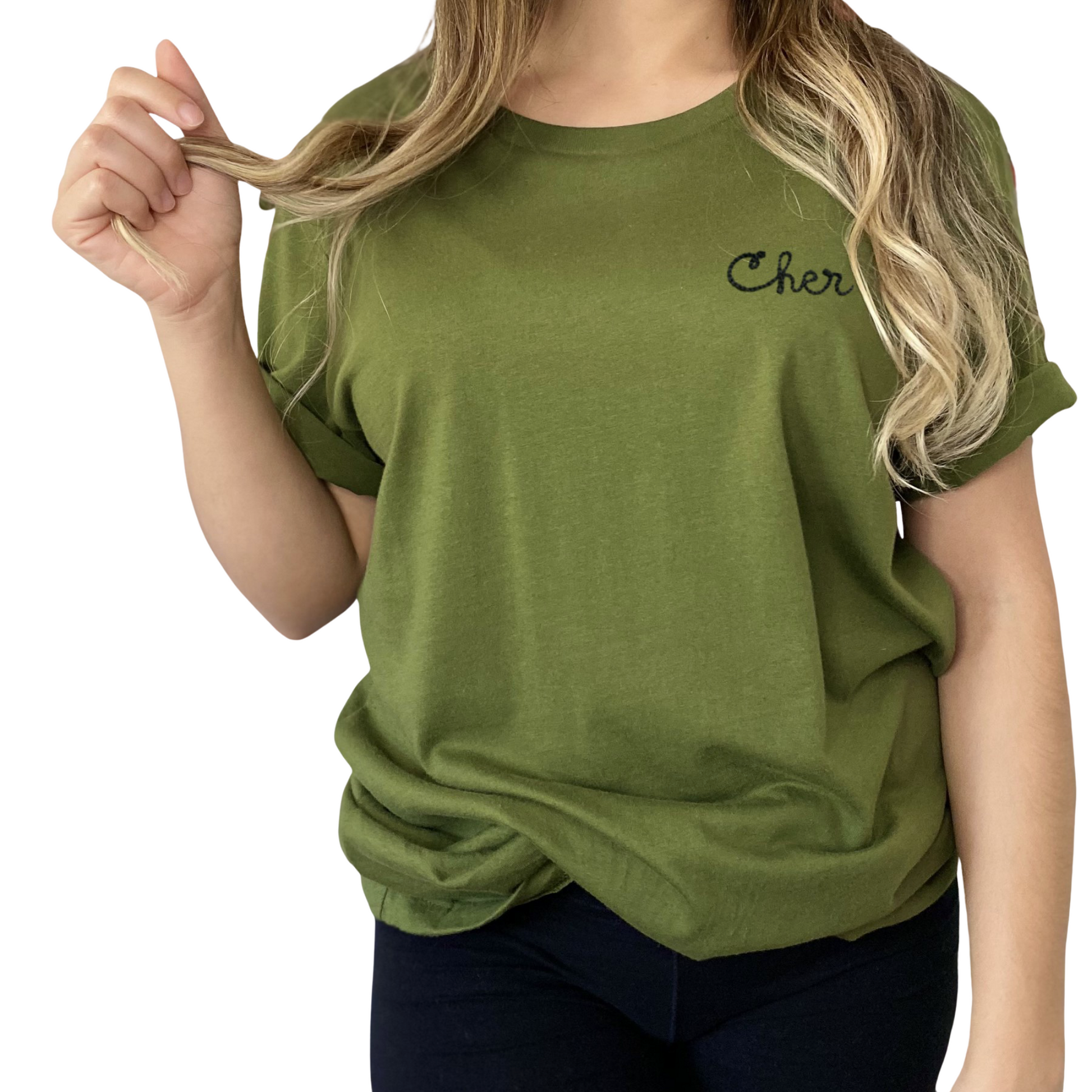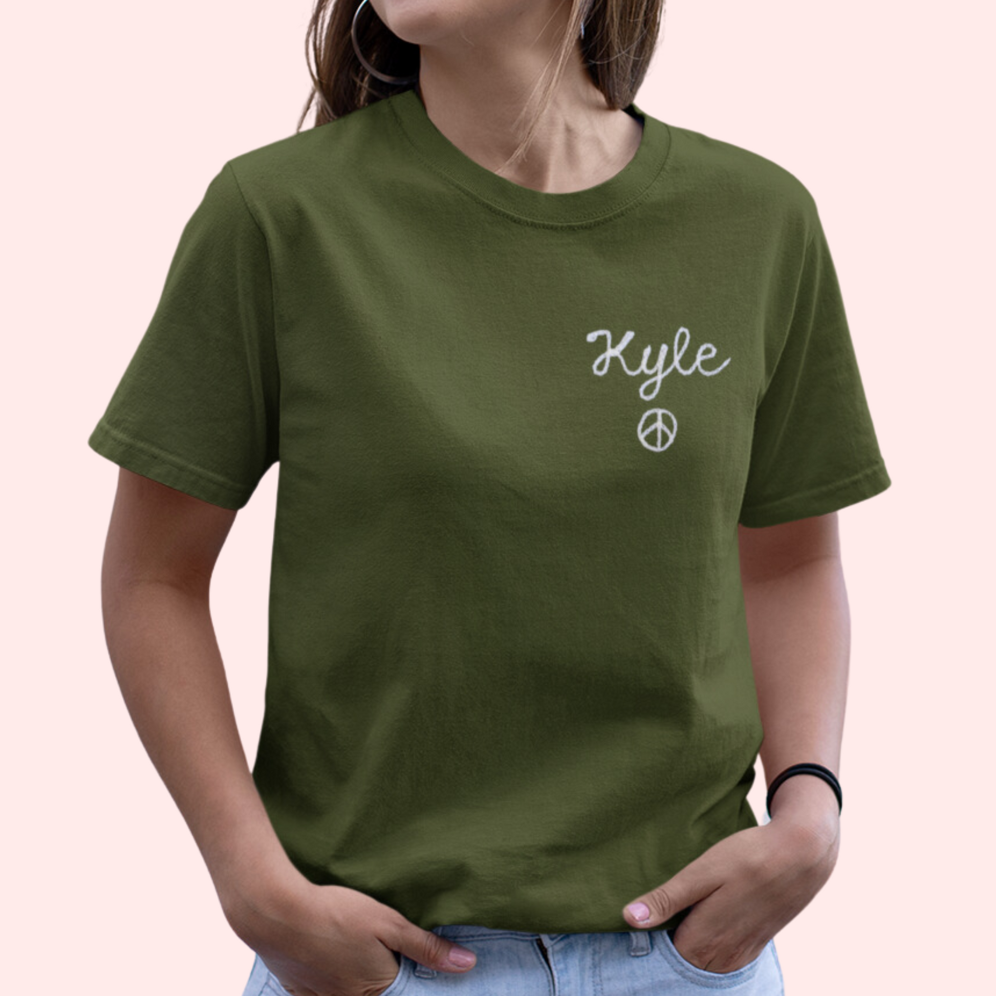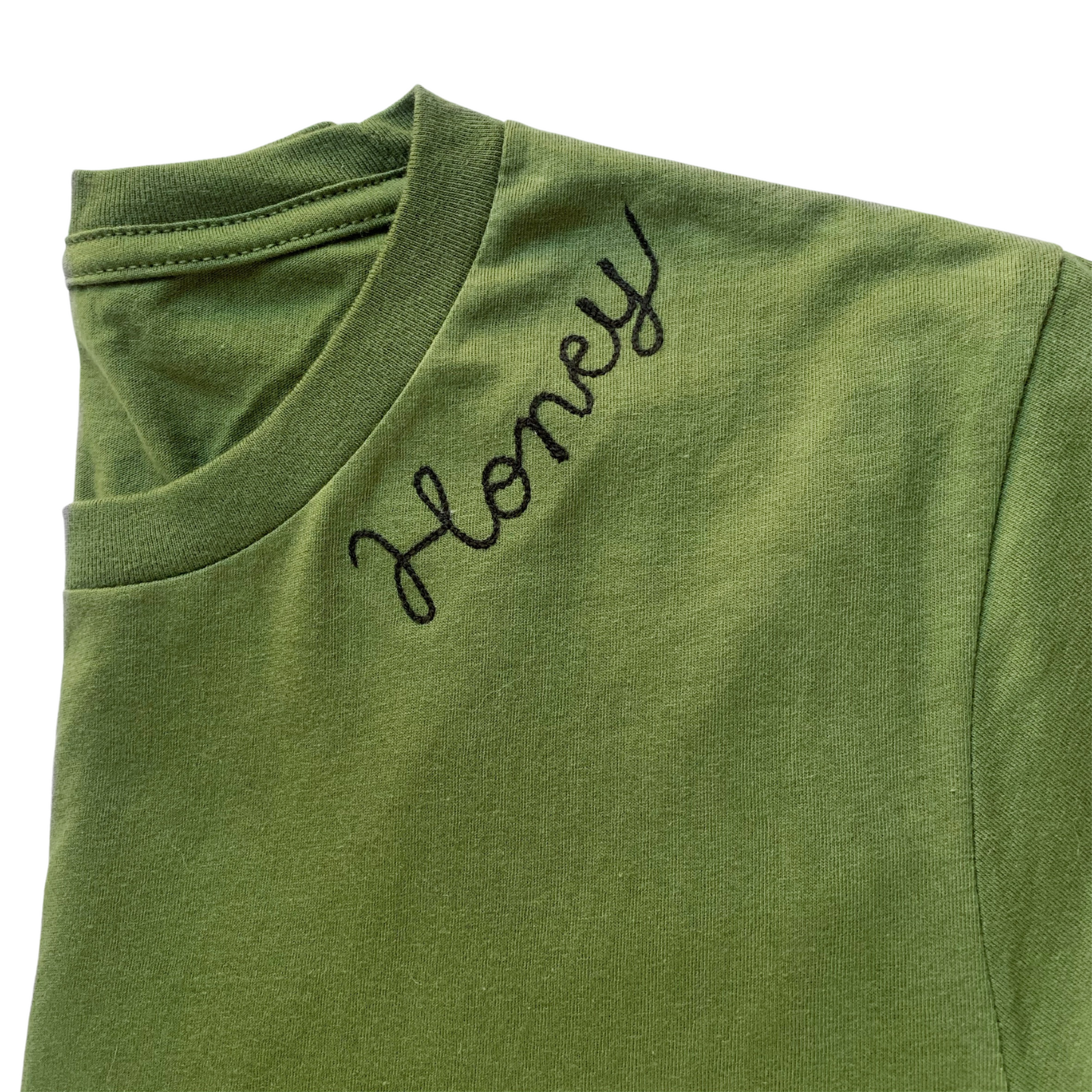 Our best selling olive t-shirt, personalized with chainstitch embroidery. Design your own custom tee with vintage-style chainstitch lettering. An elevated basic you'll love for years to come.