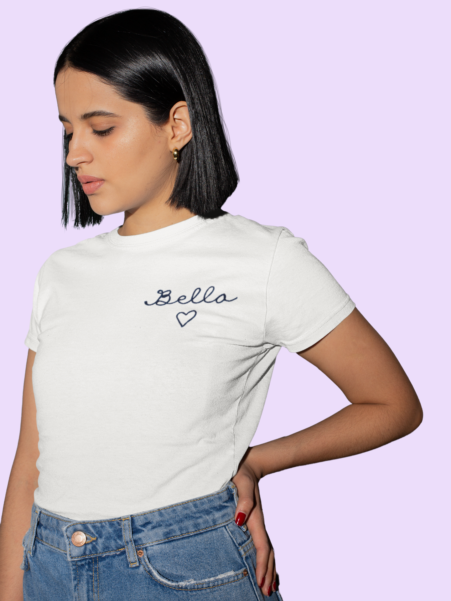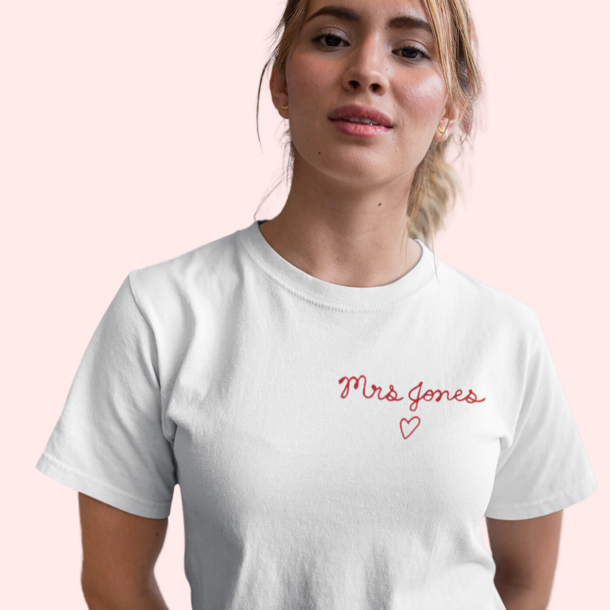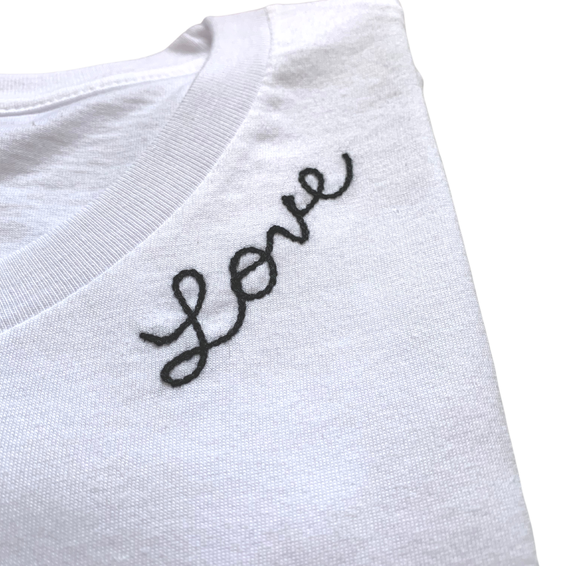 Our best selling white t-shirt, personalized with chainstitch embroidery. Design your own custom tee with vintage-style chainstitch lettering. An elevated basic you'll love for years to come.