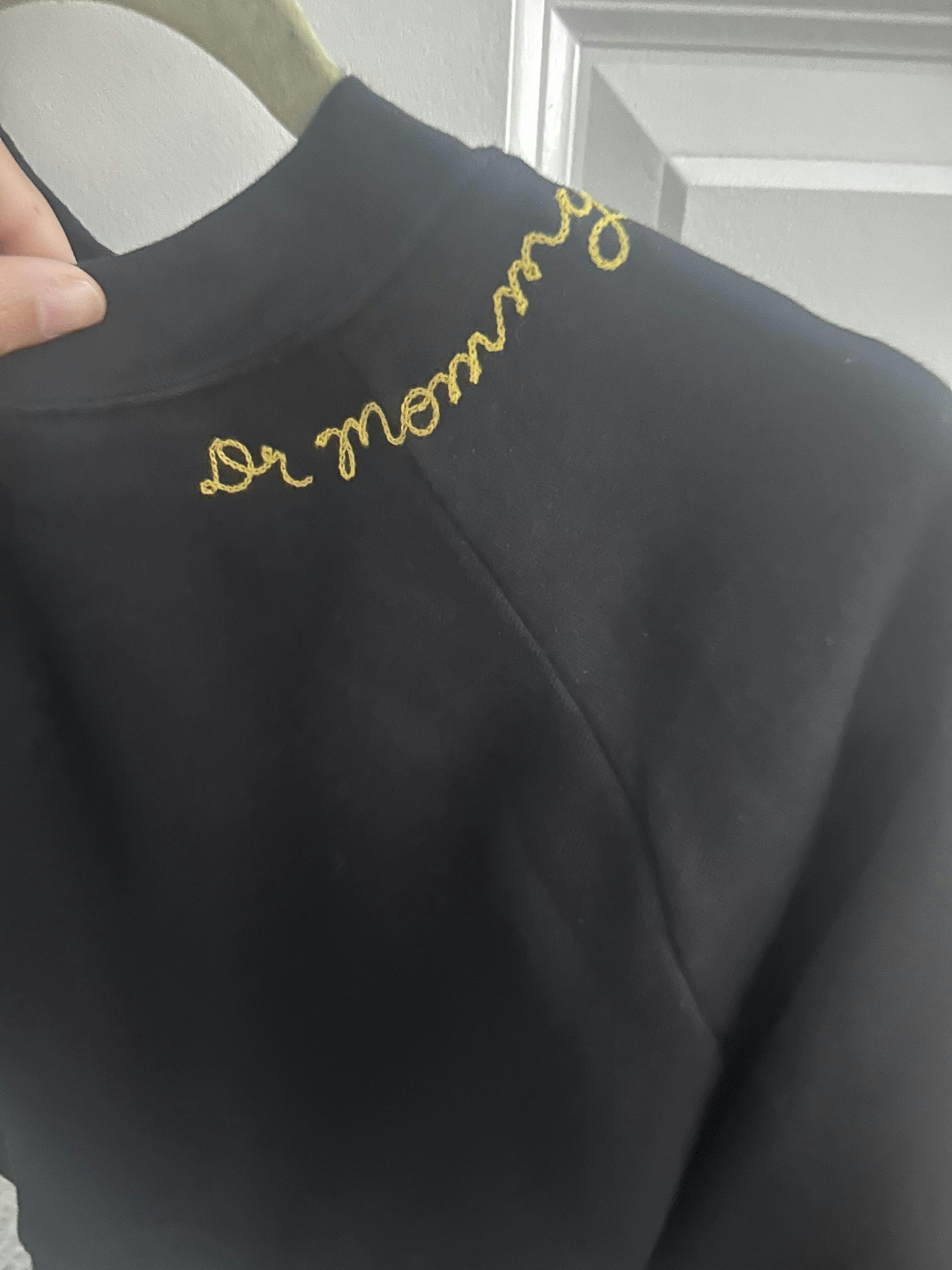The sweatshirt is soft, and the stitching is beautiful. I just wish they included the period in the lettering for Dr. Mommy.